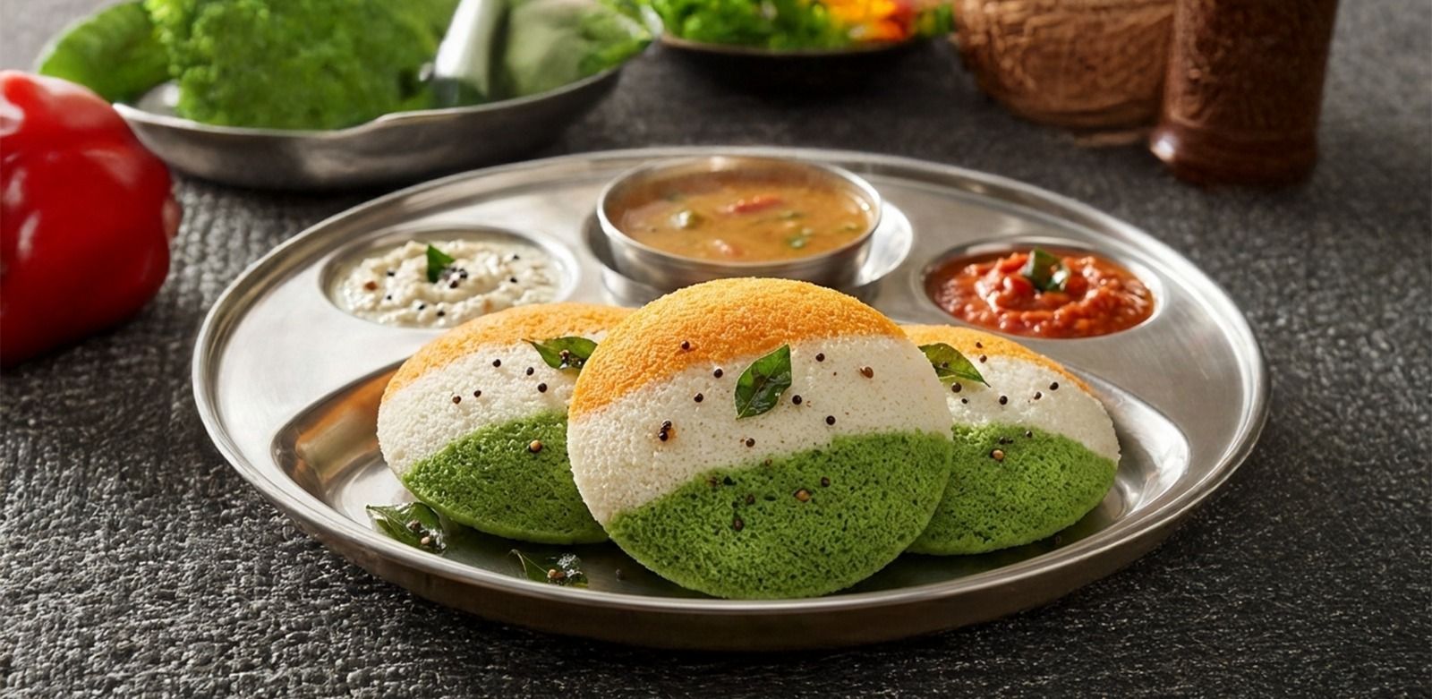 Tricolor rava idli for Republic Day, served with coconut chutney and sambar